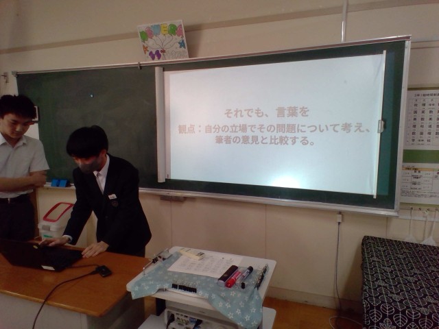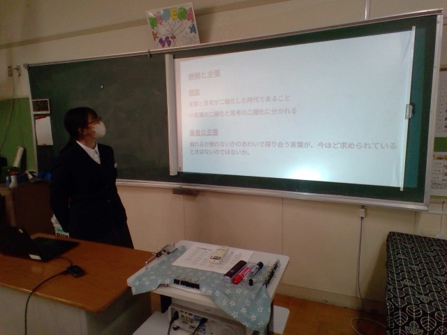 国語の授業では、文章を深読みするために自分たちで観点を立てて、その観点を基に論説、随筆、詩の読解に取り組んでいます。今回は深読みした内容をスライドにまとめたものを班で発表しました。どの班も短い準備期間で、高いクオリティを用意していました。