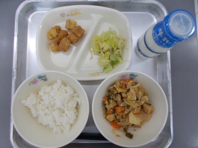 本日の献立は、ご飯、牛乳、たらのコロコロ揚げ、高野豆腐の卵とじ、甘酢和え でした。