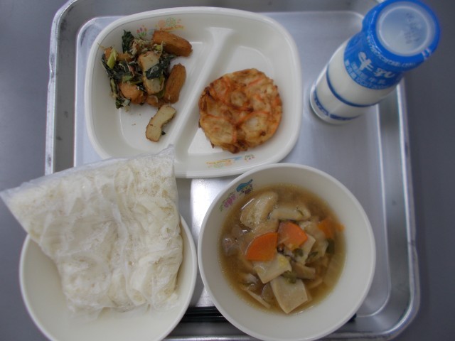 本日の献立は、五目きしめん、牛乳、愛知の野菜かき揚げ、小松菜としらすの炒め物 でした。