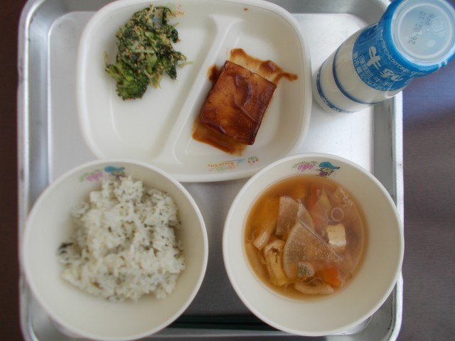 本日の献立は、菜めし田楽(愛知の大根菜ご飯 みそ田楽)、牛乳、ブロッコリーのごま和え、八杯汁 でした。