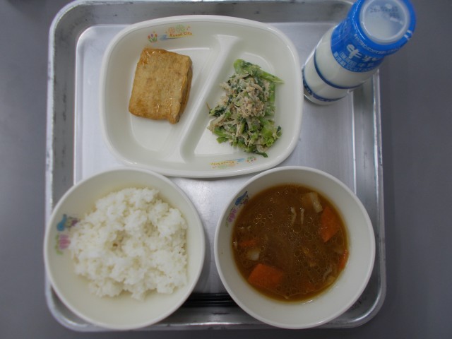本日の献立は、ご飯、牛乳、野菜入り信田のしょうがあんかけ、菜花のごまささみ和え、根菜たっぷり豚汁 でした。