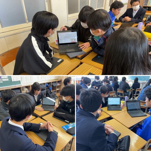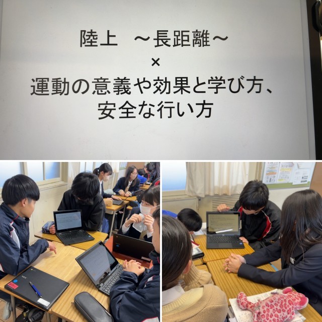 なぜ持久走を行うのか考え、実際に持久走の授業を行いながら、どうしたら早く走れるのか、体力が高まるのか、自分の走り方・姿勢などを考え、スライドにまとめ、発表を行いました。
