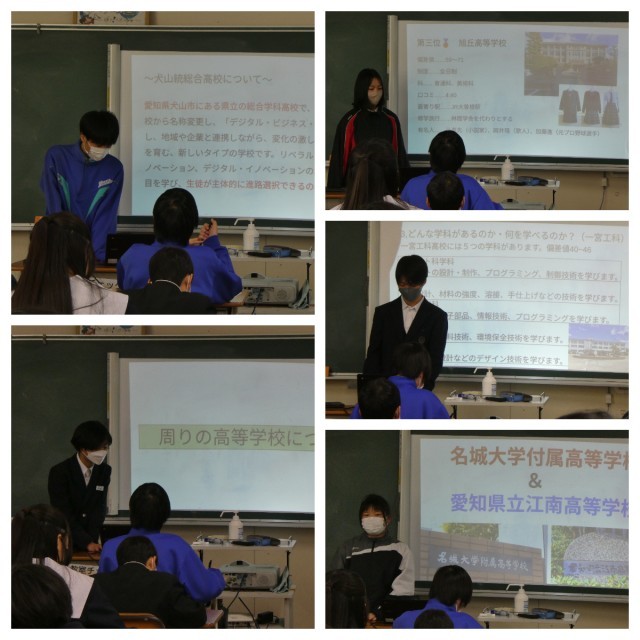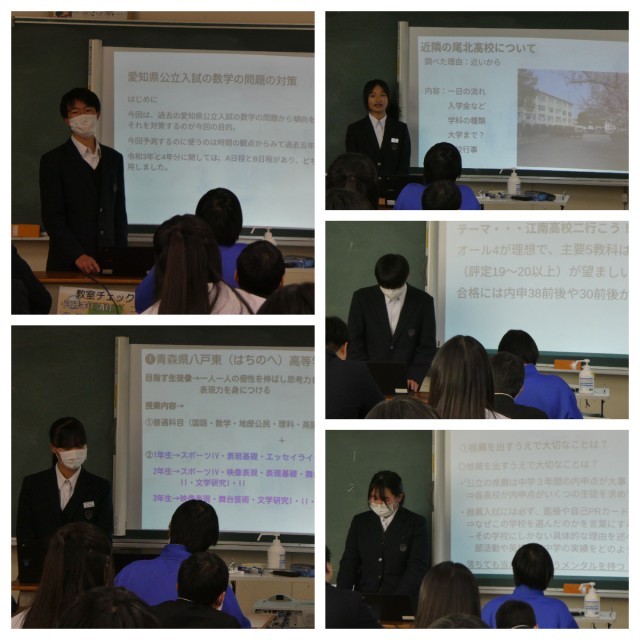 本日の総合学習の時間は、各学級代表に選ばれた生徒が、他学級に自分の調べたことを発表しに行きました。学級の代表だけあって、内容が充実しており、聞いている生徒も新しい情報をたくさん得ることができ、学びの多い機会となりました。