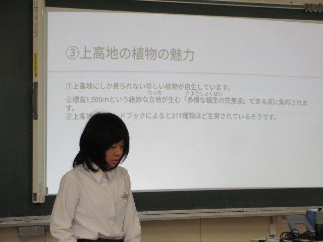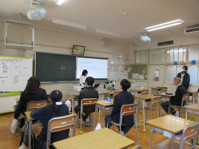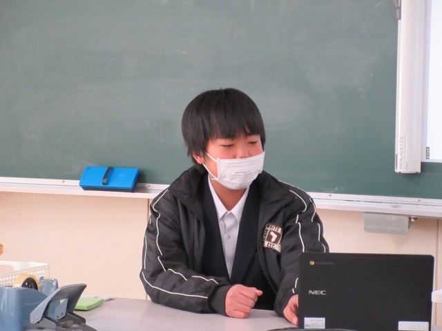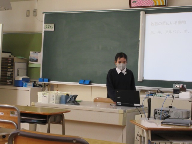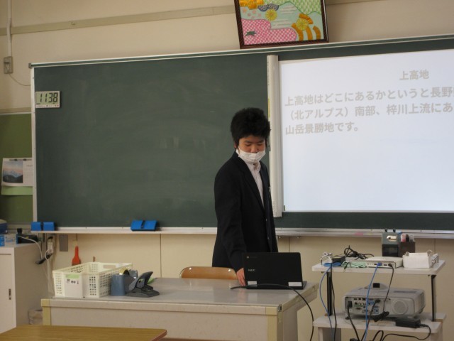 総合の時間の様子です。5月に行く野外学習についての調べ学習を発表しています。生徒一人一人が興味、関心を持っていることをスライドにまとめて発表しました。