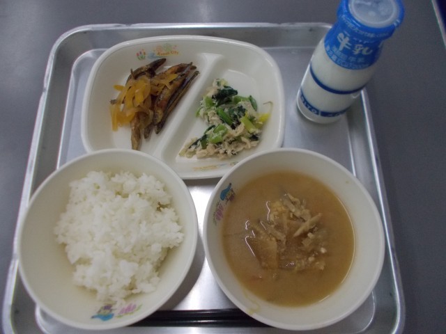 本日の献立は、ご飯、牛乳、きびなごの南蛮漬け、小松菜のささみ和え、ご汁 でした。
