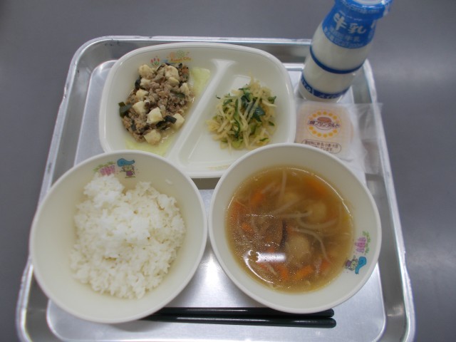 本日の献立は、ご飯、牛乳、豆腐のレバーそぼろ炒め、切り干し大根の中華サラダ、鶏団子のスープ、プリンタルト でした。