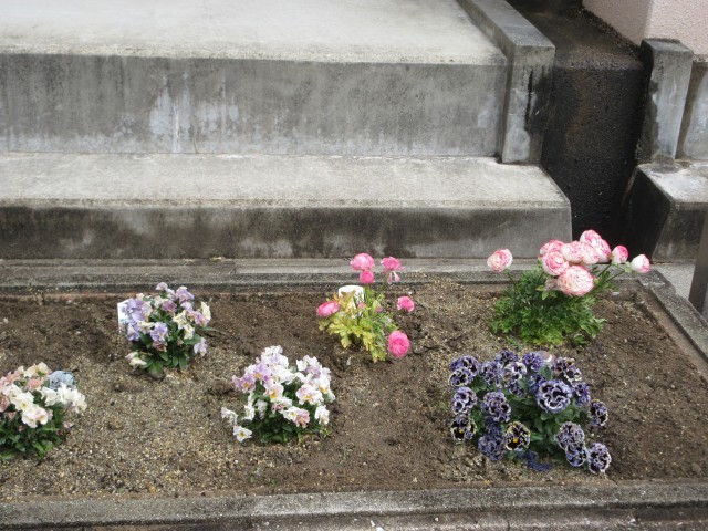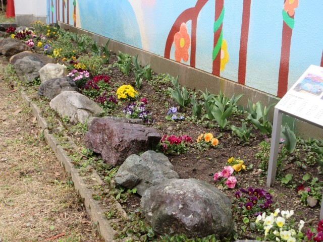 緑化委員会で植え付けをしたお花がとてもきれいに咲いています。一枚目の写真は、生徒たちが4色のチューリップとビオラをデザインして植えたものです。ハッピーガーデン前はもう少しで咲きそうです。また、中庭をのぞいてみてください。