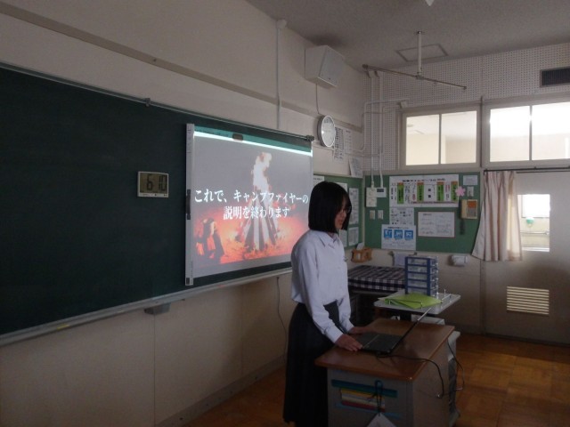 野外活動に向けて、キャンプファイヤー部がリモートで説明をしてくれました。
