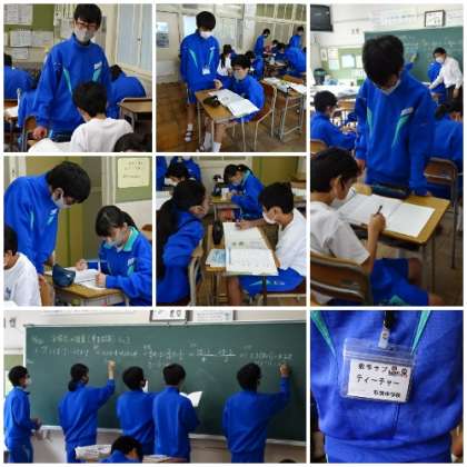 数学科は「方程式の利用」の章末問題を行いました。全問正解者がサブティーチャーとしてつまずいている生徒にアドバイスをしていました。