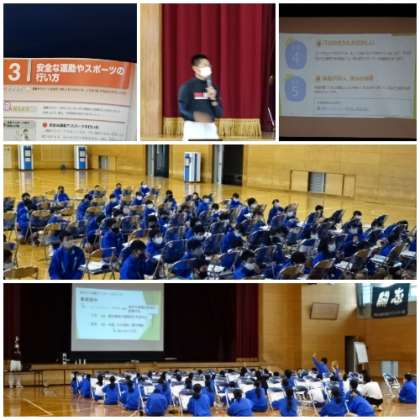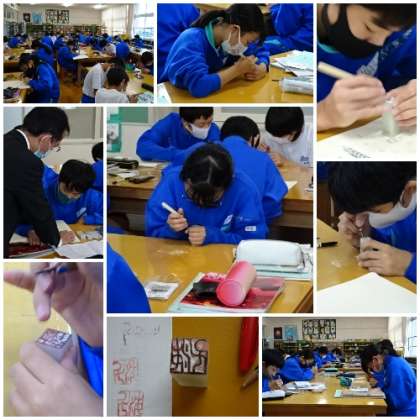 美術科は篆刻、保健体育科の保健分野は「安全な運動やスポーツの行い方」、国語科は書写の学習の様子です。