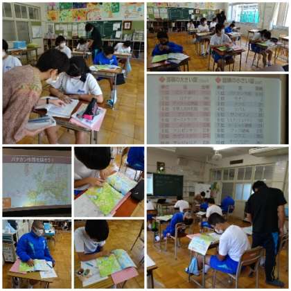 「世界の国や地域」を学ぶ学習です。面積が最大の国、最小の国を探しました。地図帳の地名索引の使い方を知り、実際に「バチカン市国」の位置を調べました。日本は国土面積が大きい方なのか小さな方なのか調べました。