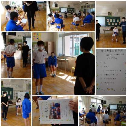 英語の時間ですので、英語を使った「フルーツバスケット」を全員で行いました。 みんなが「What's do you lile?」と聞きます。鬼は「I like 〜」と答え、ゲームが始まります。ゲームのあと、一人ずつお別れの挨拶をしました。 前時に英語と日本語で書いたお礼の手紙をまとめた冊子をプレゼントとして手渡しました。