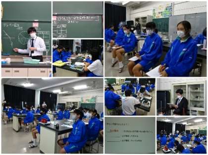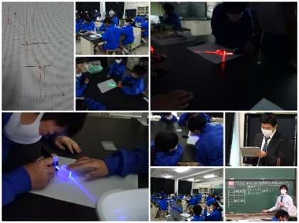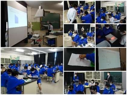 台形レンズにLEDライトをあて、光の屈折の様子を調べました。実習生が実験の手順を説明し、生徒は注意事項を守りながら実験を行うことができました。