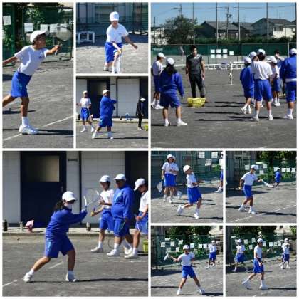 「ソフトテニス」の学習をしています。教員が出したボールをフォアハンドでネットの向こう側へ返す練習を繰り返し行いました。