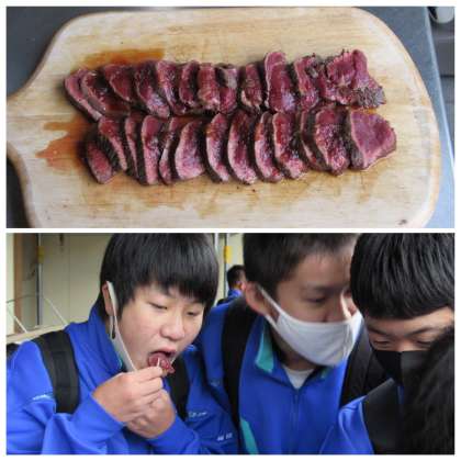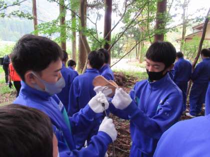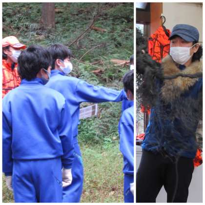 狩猟体験が終わりました。罠の種類や方法の説明を受け、実際に獣道や動物の痕跡を探しました。罠を班で協力して仕掛け、最後は鹿の肉をおいしくいただきました。充実した体験でした。