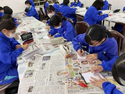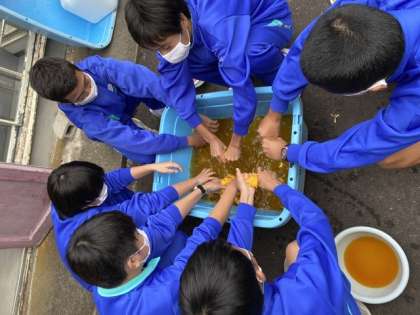 今回使った植物は玉ねぎでした!身近な植物で染められて、1点1点異なる作品になる草木染めのおもしろさをみんなで学びました。おまけのハガキまで染めて、大満足のみんなです。