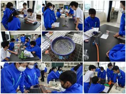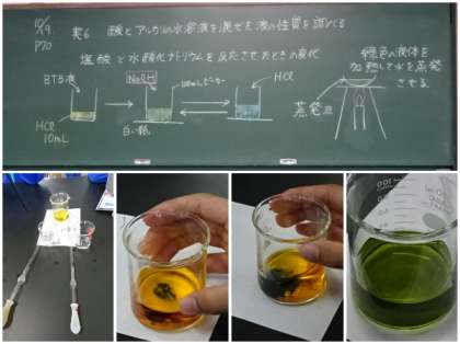 酸とアルカリの水溶液を混ぜた液の性質を調べました。塩酸に緑色のBTB溶液を加えると黄色くなります。そこへ水酸化ナトリウム水溶液を加えアルカリ性にします。さらに、塩酸を加え中性(緑色)にします。最後に水溶液を蒸発させ観察します。