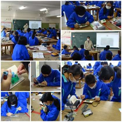 端子と基板のはんだづけを行いました。集中力のいる作業ですが、くっついた端子と基板をながめ、うれしそうにしている生徒もいます。