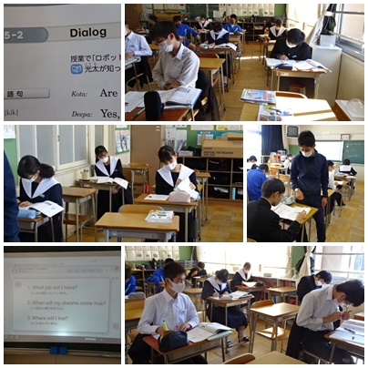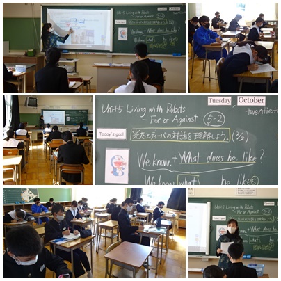 「Unit5 Living with Robots-For or Against」の「Dialog」の光太とディーパの対話を読み、本文の内容が理解できているか、生徒に質問しながら内容を確かめました。