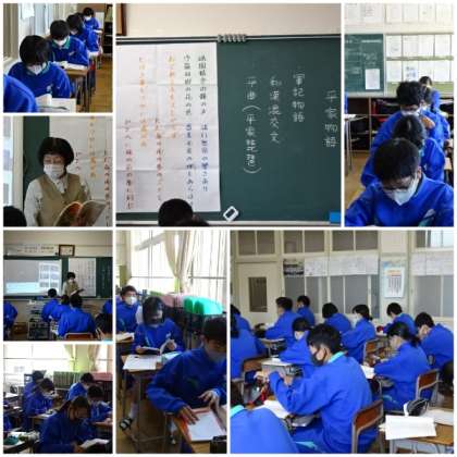 3組の様子です。「扇の的−『平家物語』」の学習に入りました。冒頭部分「祇園精舎の鐘の声……」のリズムや歴史的仮名遣いを感じながら音読を進めました。