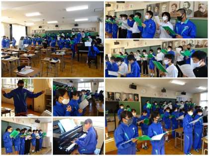 合唱曲「虹」の練習の様子です。正しい音程でハーモニーに気を付けて歌うことができました。