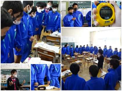 「神経系」の学習です。輪になって手をつなぎます。代表一人がストップウォッチを持ち、反対側の手で隣の人の手を握ります。手を握られた人は次の人の手を握ります。これを続けて行って、ストップウォッチを持った人に伝わったら時計を止めます。