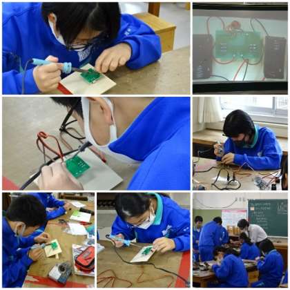 自作マシンのリモコン部分を作成しています。映像や組み立て図を見ながら、コードの端子と基板のはんだづけを行いました。