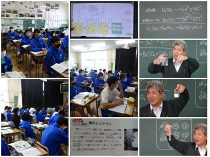 「中和と塩」の学習で、前時に学習した塩酸と水酸化ナトリウムを混ぜ合わせたときの化学反応式について復習しました。この反応とは別に、硫酸に水酸化バリウムを混ぜ合わせる演示実験を行いました。透明な硫酸があっという間に白濁しました。硫酸バリウム(塩)と水ができました。この硫酸バリウムは胃のレントゲン撮影のときに造影剤として使われます。