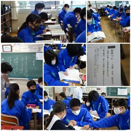 「万葉集」「古今和歌集」「新古今和歌集」の歌を比較し、和歌に表れた作者の心情や情景を想像しながらワークシートの問題に取り組んでいました。
