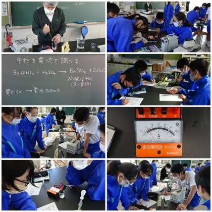 「中和」の様子を電流計で確かめる実験を行いました。中和が進むにつれ電流の流れが0mAに近づくことを確認しました。実験結果を基に化学変化のしくみについて考え、話し合いを行いました。