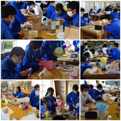 「ランプシェード」作成の様子です。骨組みに和紙を貼って形を整えていきます。