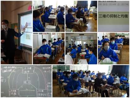 「三権の抑制と均衡」の学習です。三権分立の仕組みとその意義について学習しました。また、「憲法の番人」とはどういう意味か、違憲審査制の意義とその性質について考えました。