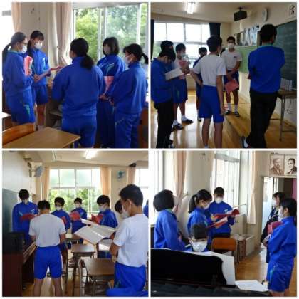 3年生は11/12のDVD撮影に向けて、7時40分から第2多目的室、体育館、音楽室の3か所で合唱の練習を行っています。旧江南市文化会館でのコンクールはできませんが、中学校時代の総決算として「学級合唱」にかける意気込みは半端なものではありません。早朝の静かな職員室にいると合唱の声が聞こえてきます。