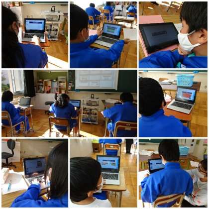 「世界の国を紹介する」ため、タブレット端末を使ってプレゼンを作成しています。