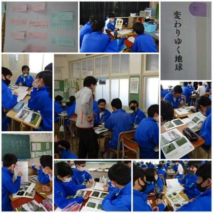 「変わりゆく地球」(内容項目:自然愛護)の学習です。 気候変動や開発による地球の変化の写真から、自然環境保全のための解決策についてグループで話し合い、意見交流を行いました。
