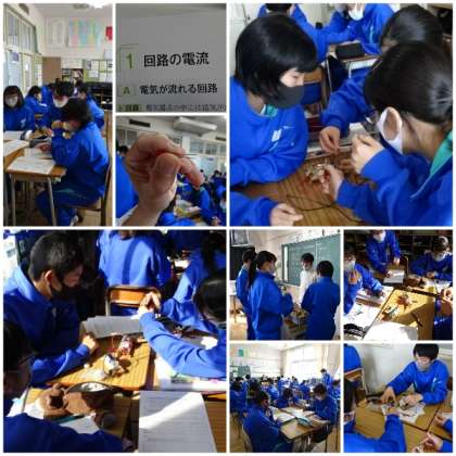 「回路の電流」の学習です。本時の学習課題は「電流の流れが+→−であることを確かめよう」です。生徒は次の3つの実験を行いました。果たして実験結果から電流はプラスからマイナスへ流れることが言えたかな?