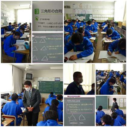 「三角形の合同」の学習です。三角形の決定条件を基にして合同な三角形をかくのに必要な条件を見いだしました。また、合同な図形の性質について四角形でも確認しました。