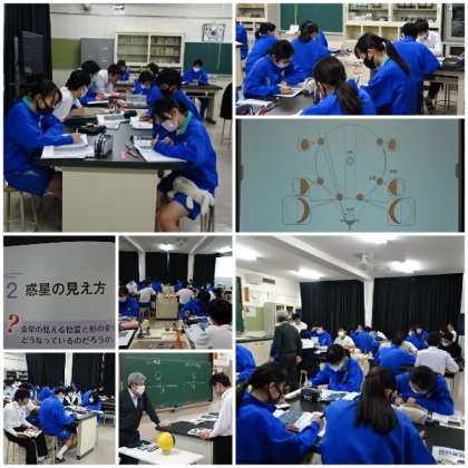 「惑星の見え方」の学習です。月の満ち欠けの学習後に金星の見え方について学習しました。地球と金星の位置関係から金星の見える方角や時刻、形の変化について考えました。