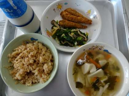 今日の給食は、三河赤鶏五目ごはん、牛乳、メヒカリフライ、きのこと小松菜のあえもの、みつ葉のお吸い物です。