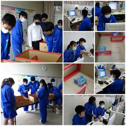 「プログラミングの基礎」の学習です。「プロロボ」が「迷路を抜ける」ようにプログラムしました。正しくプログラミングできたか確かめるために、段ボールで作った迷路に「プロロボ」を実際に走らせました。果たして「プロロボ」は迷路を抜けるように動いたでしょうか?
