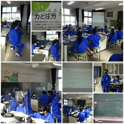 物理分野の学習である「力と圧力」の第1時「力のはたらき」の授業です。どのような場合に物体に力がはたらいているのかについて関心をもち、日常のさまざまな事象に目を向けて調べようとしていました。