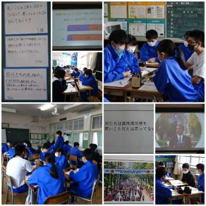「平和への願い」(内容項目:国際理解、国際貢献)の学習です。平和記念資料館を訪れたときのエピソードを題材に、同じ仲間の人間として、私たちが忘れていけないこと、これからの人生でできることについて意見交流をしました。