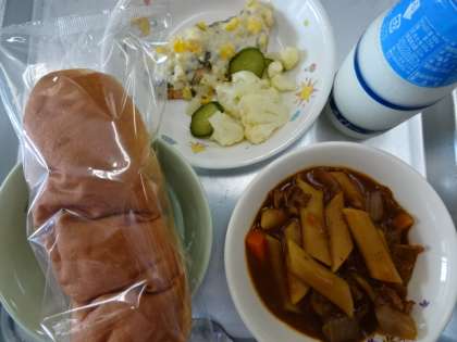 今日の給食は、愛知の米粉パン、牛乳、鮭のネギマヨ焼き、ペンネのブラウン煮、カリフラワーのサラダです。