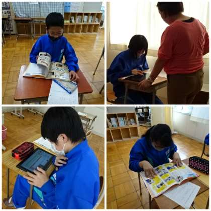 総合的な学習の時間には、タブレット端末や書籍を使って職業調べを行いました。