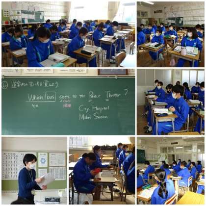 「Daily Scene5」道案内の学習です。乗り物での行き方を尋ねたり教えたりする表現を学びました。Which bus goes to the Palace Theater? Take Bus No.104.