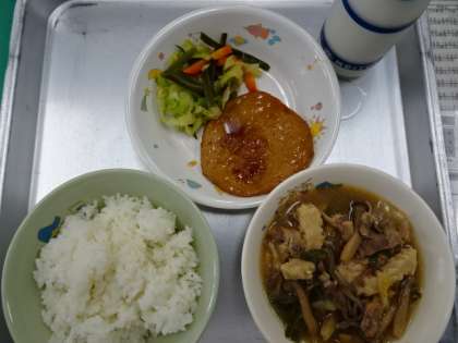 今日の給食は、ごはん、牛乳、焼きはんぺんの生姜醤油、名古屋コーチンのひきずり、茎ワカメのあえものです。