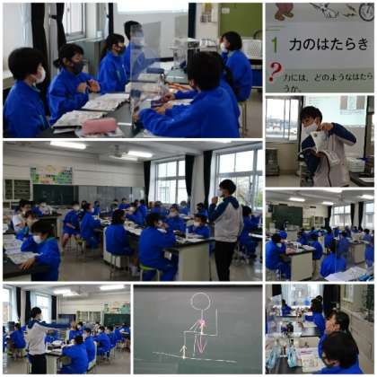 「力と圧力」の第1時の授業です。身近な現象から力がはたらいている場面を見いだし、力がはたらくとその物体が変形したり、物体の運動の様子が変わったりすることを見いだしました。