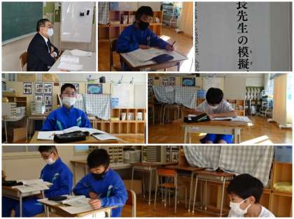 「校長先生の模擬面接」の学習です。入試に備えた模擬面接の場面の題材から、ルールとマナー、エチケットの違いについて考え、話し合いました。