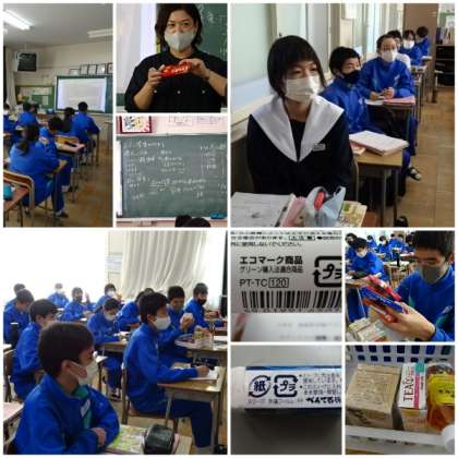 「環境に配慮した消費生活」の学習です。身近な商品にエコマーク製品があることを知り、持続可能な発展による循環型社会を展望して、環境に配慮した商品や店を選ぶ消費者(グリーンコンシューマー)になる必要があることを学びました。