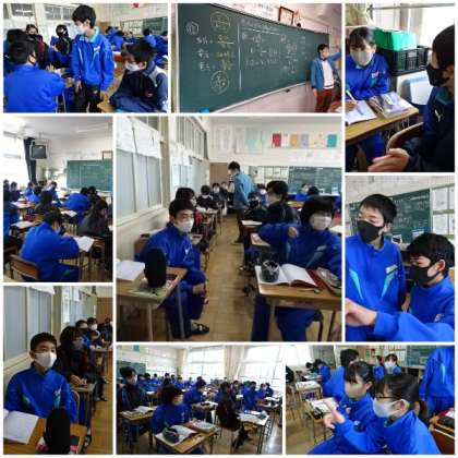 「オームの法則」「抵抗の接続」」の学習です。オームの法則を用いて、教科担任が出題した回路図の電流、電圧、抵抗を計算して求めました。座席の前後左右の級友に聞いたりして理解を深めました。